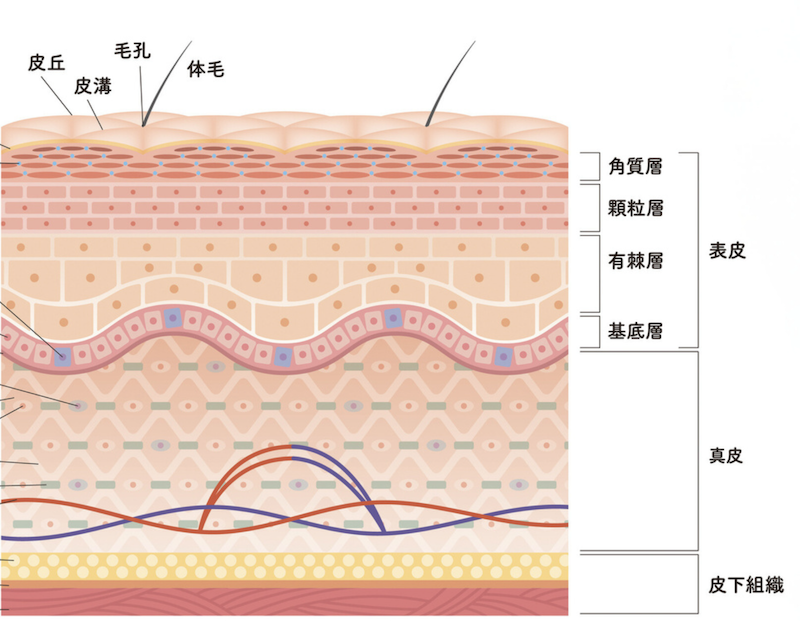 表面の表皮層は角質層、顆粒層、有棘層、基底層で成り立ち、真皮層には毛細血管やエラスチン、コラーゲン、ヒアルロン酸などが蓄えられています。皮下組織は皮下脂肪や筋膜、筋肉などを指します。
